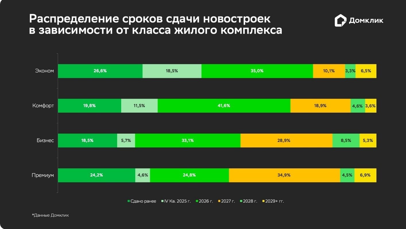 Самые распространённые в России ЖК комфорт-класса имеют самую низкую долю ипотек со сроком сдачи после 2028 года — всего 3,6%. В последние полгода ипотечные заёмщики преимущественно приобретали объекты, где предполагаемый срок ввода — 2026 год (41,6%).