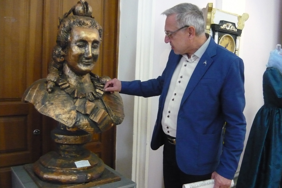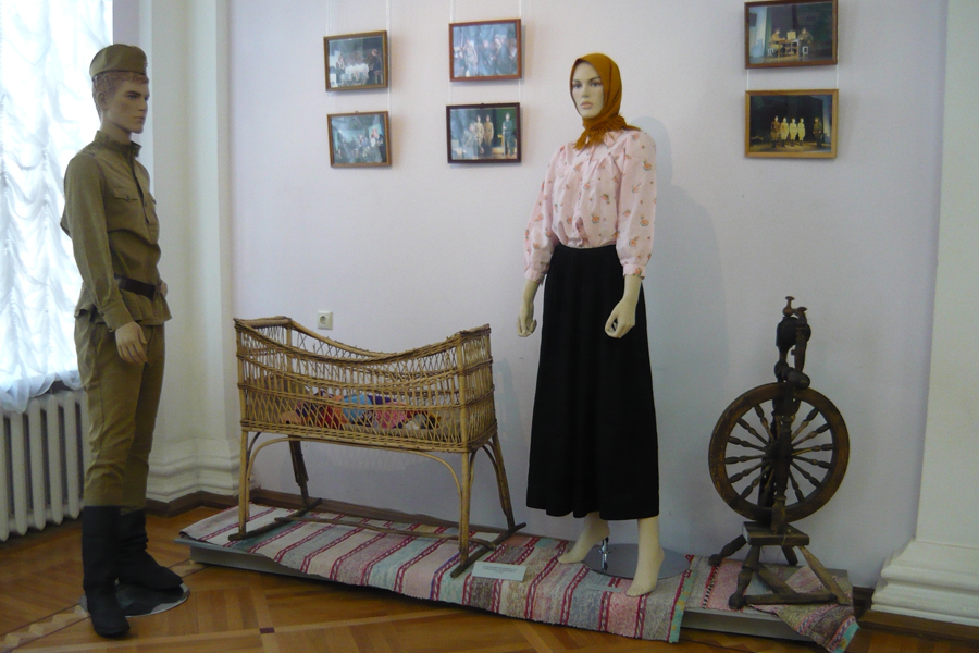Впрочем, каждый уголок выставки замечателен и уникален. Чего стоит «бронзовый» бюст великой императрицы, созданный из картона к спектаклю моршанцев «Волшебная сила любви», или на удивление профессионально сделанные куклы из села Хитрово. Привлекают внимание пышные наряды Котовского театра к «Дуэнье», стильная простота экспозиции к спектаклю глазковцев «Семь мисок, семь ложек», патиссон, вместо тыквы для кареты в спектакле бурнакцев «Золушка».