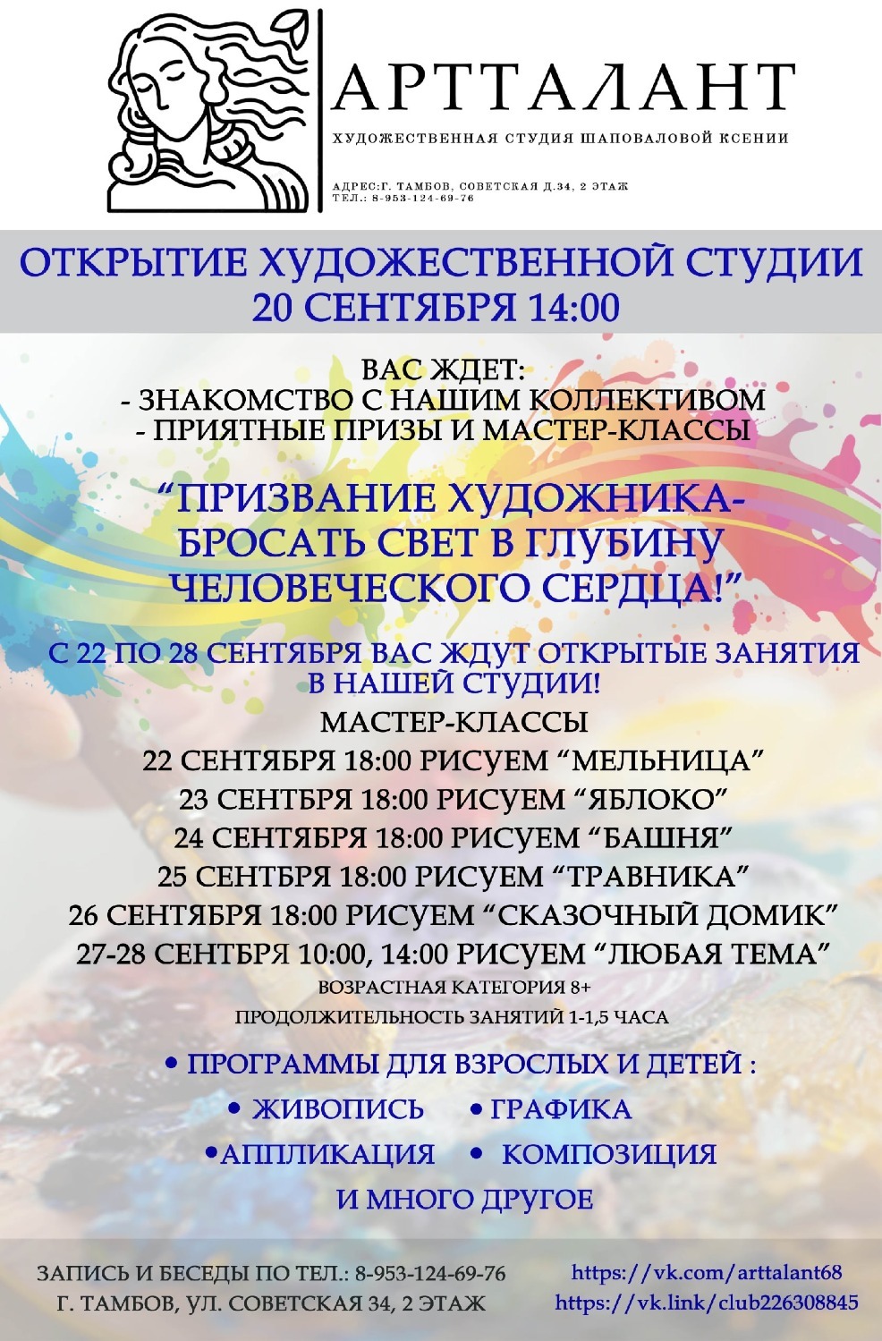 20 сентября состоится открытие художественной студии Ксении Шаповаловой «Артталант», а затем пройдет серия открытых уроков — мастер-классов (6+). Каждый урок будет посвящён отдельной теме и истории какого-либо города или округа Тамбовской области. А ещё мастер-классы пройдут в преддверии и будут посвящены Дню образования Тамбовской области, который приходится на 27 сентября. Мастер-классы пройдут при поддержке регионального министерства туризма в рамках недели туризма Тамбовской области, партнёр мастер-классов — проект «Страницы истории. Дети».