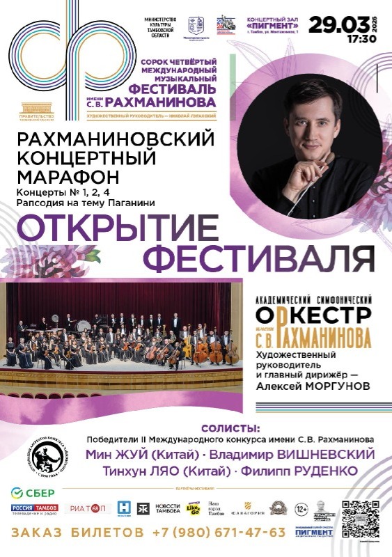 В концертном зале «Пигмент» (Тамбов, Монтажников, 1) 29 марта состоится открытие 44-го Международного музыкального фестиваля имени С.В. Рахманинова. По поручению правительства Тамбовской области функции исполнительной дирекции фестиваля в этом году снова возложены на Академический симфонический оркестр имени С. В. Рахманинова. Художественный руководитель фестиваля – известный пианист Николай Луганский (Москва), исполнительный директор – главный дирижер оркестра Алексей Моргунов (Тамбов).