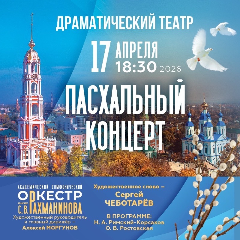 В Тамбовском драматическом театре 17 апреля в 18:30 состоится пасхальный концерт (0+). На сцену выйдут симфонический оркестр имени Рахманинова под управлением дирижёра Алексея Моргунова и лауреат премии «Золотая маска» Сергей Чеботарёв.
