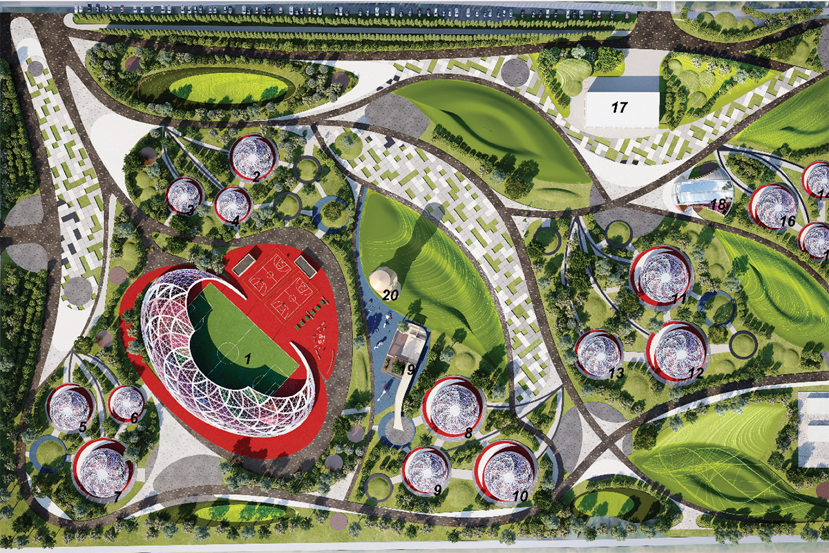 Вишнёвая ветка с космическими привлекательными планетами обвивает сердце города, которое находится в центральной части парка и является многофункциональным спортивным сооружением, кортом для активного проведения досуга. Среди объектов отдыха, напоминающих формы листьев, есть и молодые вишни, представляющие собой геопластику, — это искусственно созданный архитектурный ландшафт со скамейками для спокойного отдыха.