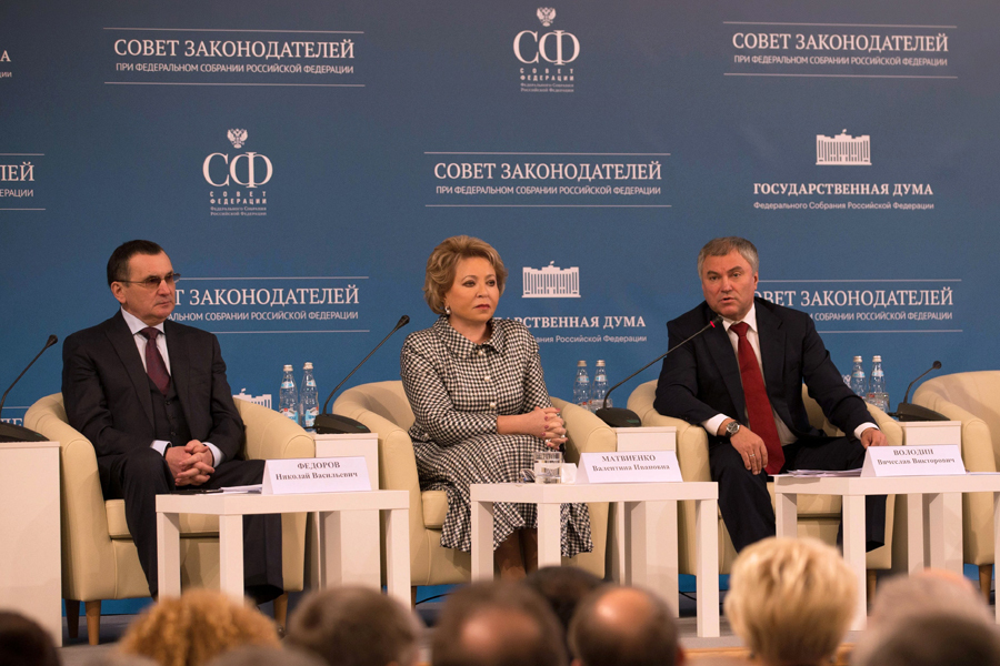 Затем с руководителями заксобраний страны шёл разговор о качестве и доступности медицинской помощи в регионах. Этот вопрос обсуждали Председатель Совета Федерации, сопредседатель Совета законодателей при Федеральном Собрании РФ Валентина Матвиенко и Председатель Государственной Думы, сопредседатель Совета законодателей при Федеральном Собрании РФ Вячеслав Володин, первый заместитель Председателя СФ, заместитель сопредседателя Совета законодателей Николай Федоров, заместитель Председателя Государственной Думы, заместитель сопредседателя Совета законодателей Ирина Яровая, Министр здравоохранения Вероника Скворцова.