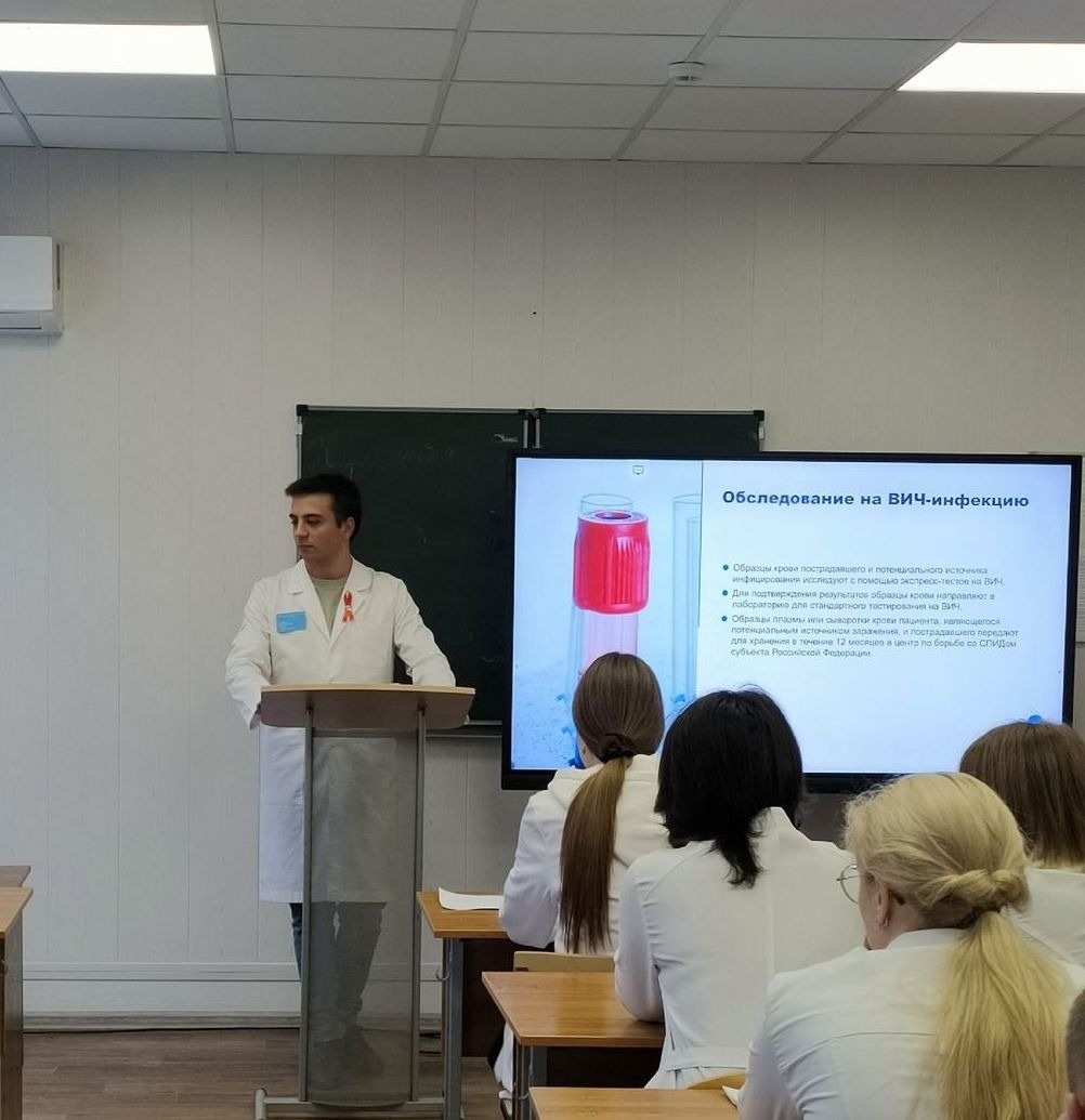 Вторую лекцию прочитал старший медбрат терапевтического отделения №1 филиала поликлиники Андрей Иванов. Для студентов-медиков тема оказалась очень важной: профилактика ВИЧ-инфекции у медицинских работников и алгоритм действий при аварийной ситуации.