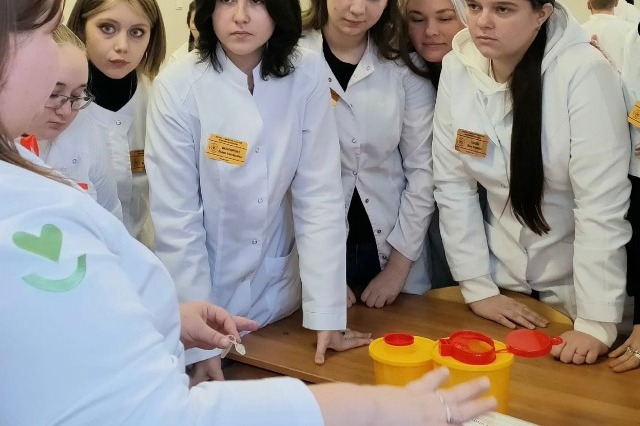 А старшая медицинская сестра хирургического отделения филиала поликлиники Екатерина Выжанова провела мастер-класс по отработке действий в аварийной ситуации с целью предотвращения профессионального заражения ВИЧ-инфекцией. Студентам рассказали о том, как проводится экспресс-тест на ВИЧ, как работать с аптечкой для аварийных ситуаций.